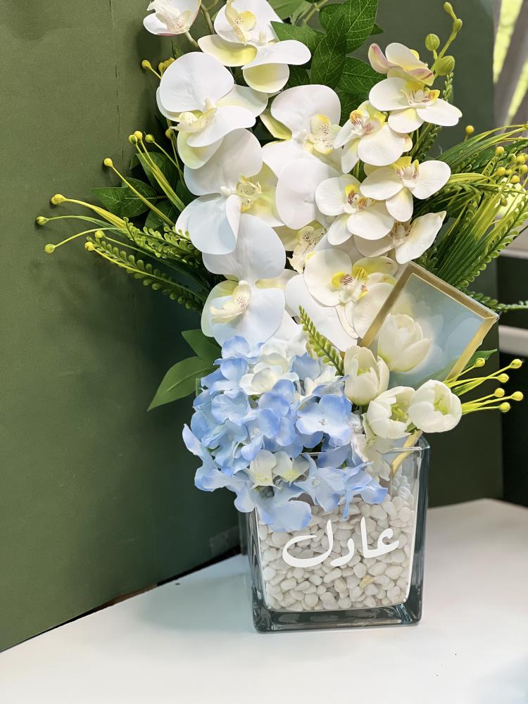 مزهرية ورد صناعي تجمع بين الذوق والفخامة. فازة زجاجية بتصميم أنيق ومعاها ورد صناعي يفتح النفس، ومعاها ظرف أكريليك مرتب تحط فيه المبلغ اللي تبغاه. والأحلى؟ نطبع لك الاسم أو العبارة اللي تحبها على الفازة عشان تصير هديتك مميزة وما تُنسى.