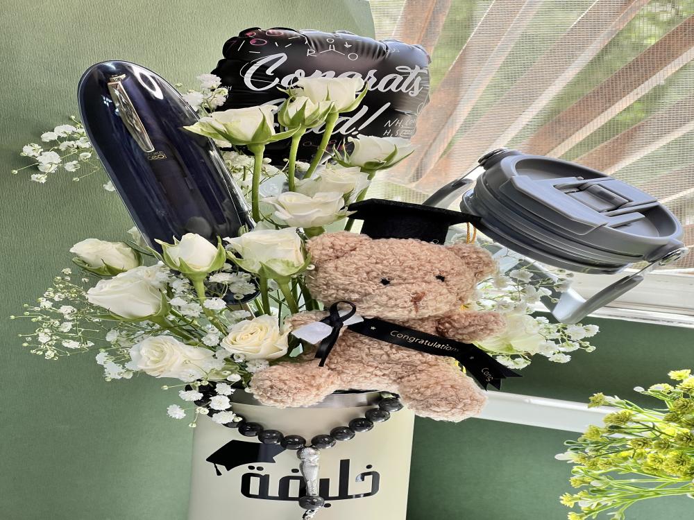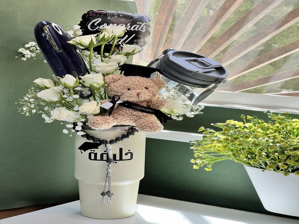 مق لحفظ المشروبات البارده والحارة مع سبحة وقلم فاخر هدية لطيفه للخريجين مزينه بالورد الطبيعي والبالون والدبدوب الخريج